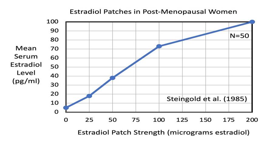 Steingold et al. (1985) studied the use of tE2 patches to treat hot flashes for 50 post-menopausal women. Four sub-groups of these 50 women used tE2 patches with either 25, 50, 100, or 200 micrograms of E2 (delivered over 24 hours). Their patches were changed twice a week and used for a total of 20 days. The frequency of hot flashes (#/hr) was measured for each woman.