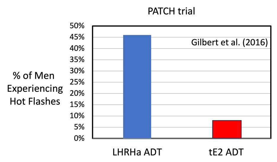 The Patch team in the UK (Gilbert et al., 2016) compared the frequency of Hot Flashes (hot “flushes”) for men on standard LHRHa ADT versus high dose tE2 ADT. They found that 46 % of men on LHRHa ADT experienced hot flashes, while only 8% of men using tE2 ADT experienced hot flashes…a significant reduction.