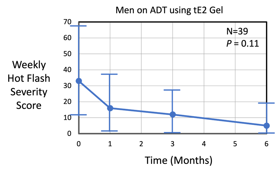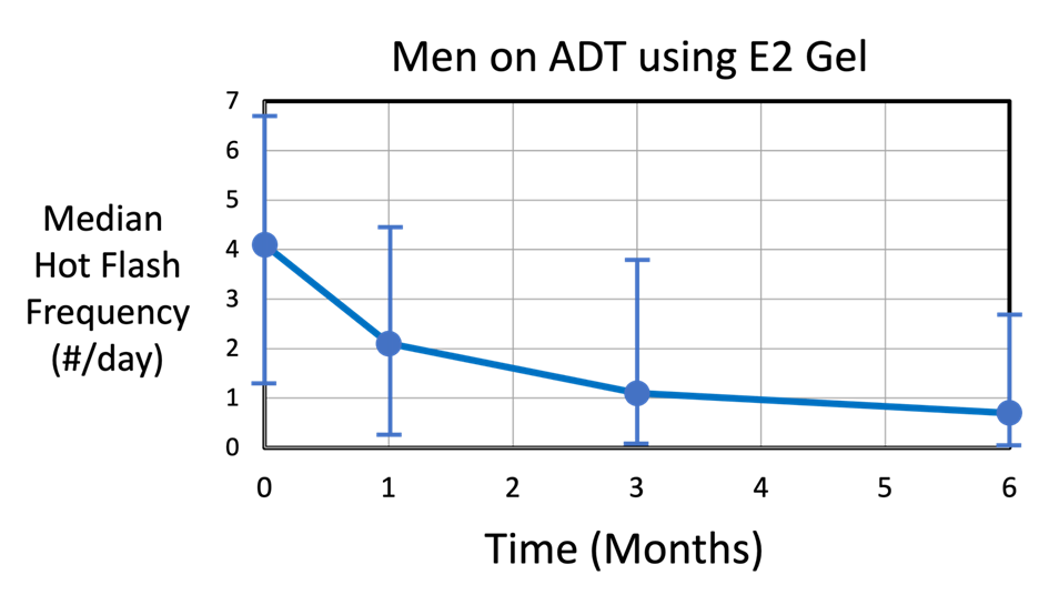 In summary, Russell et al. showed that men on ADT can significantly reduce hot flash frequency and severity by applying low concentration tE2 gel daily. This can be achieved with an average E2 serum concentration of 95 pg/ml (IQR = 73 to 116 pg/ml). Hot flash frequency and severity continues to decrease over 6 months. Russell et al.’s study confirms the effectiveness of tE2 daily topical gel in treating hot flashes from standard ADT drugs at E2 doses well below those used to suppress testosterone.