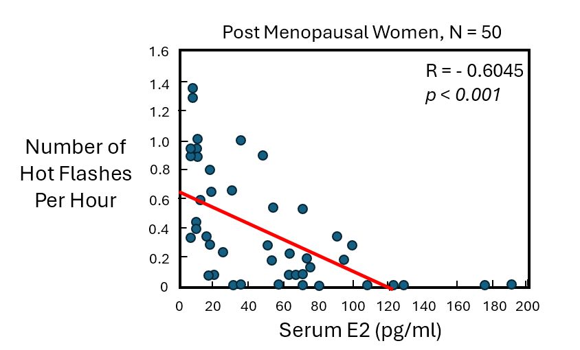 The next graph from Steingold et al. shows the hot flash frequency (#/hr) for post-menopausal women as a function of serum E2 concentration. As expected, the frequency of hot flashes decreased as the serum E2 level increased. On average, a 50% reduction in hot flash frequency (#/hr) was observed at serum E2 concentration of ~ 60 pg/ml. At serum E2 > 120 pg/ml, hot flashes were completely eliminated (in this small study). The red line is a best-fit regression line to the blue data points, with a negative correlation coefficient R = -0.6045 (p < 0.001).
